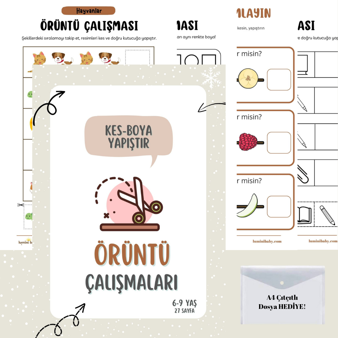Eğitici içeriklerle dolu boyama, kesme ve yapıştırma kartları çocukların gelişimine destek olurken eğlenceli vakit geçirmelerini sağlar.