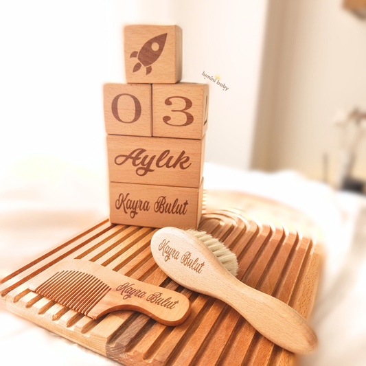 Ahşap Anı Küpü ve Tutmalı 2'li Tarak Set (Kişiye Özel)